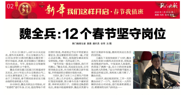 1月30日,荊門晚報頭條報道了市公交集團10路線駕駛員魏全兵連續(xù)十二年春節(jié)堅守崗位,受到廣大市民朋友們紛紛點贊。