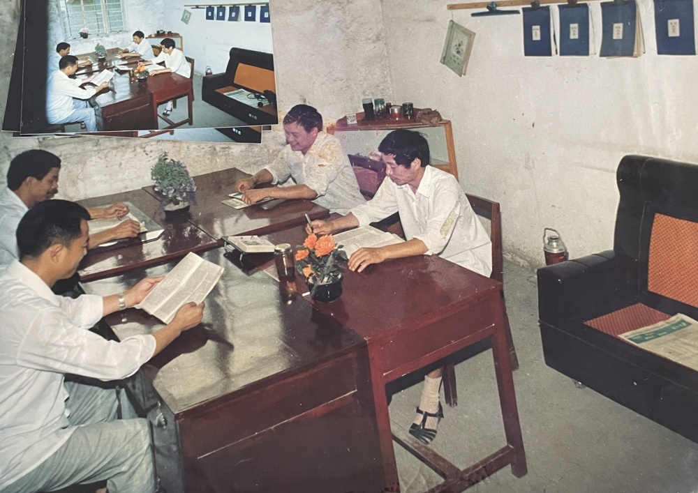 ▲80年代,機關辦公室工作場景。新舊都不一樣的四張桌子拼成一張大長桌,大家面對面圍坐著辦公。桌面上的兩盆鮮花植物,算是為數(shù)不多的裝飾。