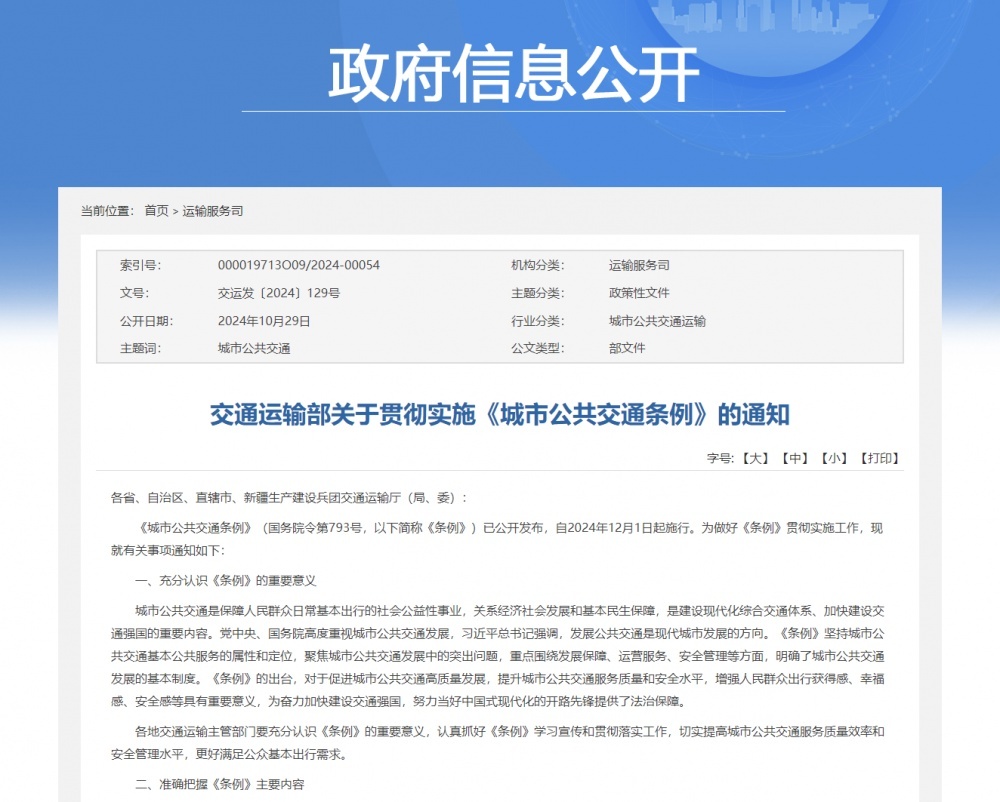 《城市公共交通條例》(國務院令第793號,以下簡稱《條例》)已公開發(fā)布,自2024年12月1日起施行。為做好《條例》貫徹實施工作,現就有關事項通知如下:
